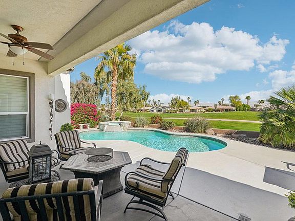Perched off the #14 green at The Golf Club at La Quinta, this stunning Anise plan is a desert sanctuary, complete with a detached casita and a sparkling pool/spa! Spanning 2,331 sq. ft. of impeccable living space, this TURNKEY furnished retreat boasts 10-foot ceilings, 8-foot interior doors, and a versatile 3BD/3.5BA layout, plus a den/office that can serve as a 4th bedroom. Step through a private wrought-iron gate into the charming front courtyard and casita entrance. Inside, the great room captivates with dramatic floor-to-ceiling stacked-stone accent walls, a cozy gas log fireplace, built-in shelving, and plantation shutters throughout. The formal dining area is perfect for hosting, while the adjacent nook, complete with a workstation/coffee center, leads into the chef's kitchen--an entertainer's dream with stainless steel appliances, built-in double ovens, a gas cooktop, slab granite counters, and a large prep island with bar seating. Guests will love the privacy of their own interior suite or the detached casita with a full bath. The expansive primary retreat offers breathtaking pool, spa, and mountain views, along with an en suite bath featuring travertine details, dual vanities, a bay window, an oversized shower, and a walk-in closet. Outdoors, your private oasis awaits--an entertainer's paradise with a built-in BBQ station, covered patio, and a flagstone-encased spa with a cascading waterfall into the freeform pool. Situated on an elevated 8,276 sq. ft. lot, enjoy front-row seats to the golf action or simply take in the stunning panoramic mountain views--this is resort-style living at its finest!