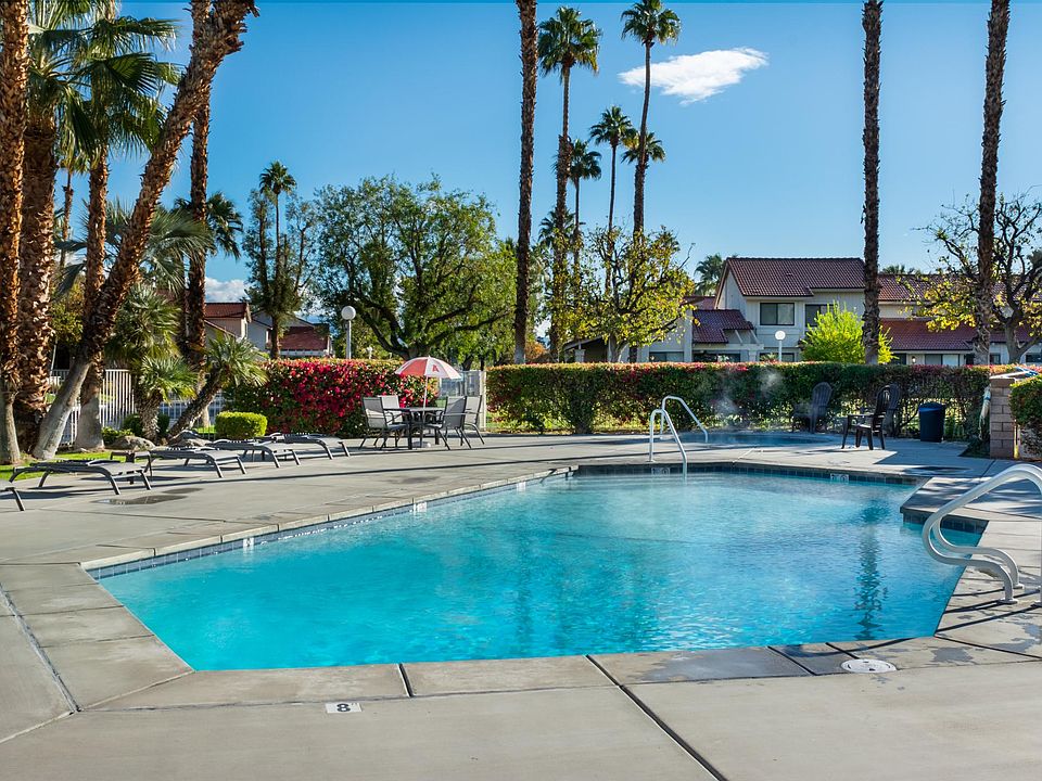 This bright spacious end-unit #8, sits on Tahquitz Creek Golf Course with stunning mountain views. New Kitchen, Appliances, Freshly Painted, New Carpet and Tile flooring downstairs. This two-level, home features a main-level bedroom and powder room downstairs, 2 bed, 2 bath up. Available starting Oct. 2025, or earlier. Offered Unfurnished on a 12-month lease. The new open kitchen and dining area flow to a private back patio, while the front patio overlooks the Golf course fairway ideal for relaxing or entertaining. Situated on a corner lot in Mountain Shadows, a gated community in South Palm Springs, residents enjoy access to a pool, tennis courts, and beautifully maintained grounds. One assigned carport space and guest parking included. Washer and dryer are located inside the unit for convenience. Located minutes from Trader Joe's, shopping, and dining. NO Lockbox, Call agent for Viewing.
