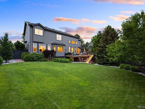 Perfectly positioned at the end of a cul-de-sac in coveted Wildcat Ridge, within walking distance to Rock Canyon, this beautifully reimagined residence is a true standout, blending refined design with top-tier upgrades at every turn. With an open, light-filled layout, the home offers effortless flow for everyday living and elevated entertaining alike. At the heart of the home, the custom chef’s kitchen stuns with Omega soft-close cabinetry, a Thermador 6-burner gas range top, marble subway tile backsplash, open shelving, under-cabinet lighting, and breakfast nook that opens up to an expansive deck complete with a modern firepit, and lush backyard views. The adjacent family room has been transformed with custom built-ins, and a sleek gas fireplace with marble mosaic surround. Elegant upgrades continue throughout: the dining room features wall panel moulding and a new light fixture, while the foyer showcases a redesigned staircase with new treads, rails, and balusters. An updated living room with large bright windows, laundry room with custom tile floor, office with custom built-ins and a striking powder room with deep navy walls and a marble-topped vanity complete the main level. Upstairs, the large primary suite includes an en suite bath with added shelving, painted cabinetry, and new tile flooring. Three additional bedrooms and two updated bathrooms complete the upper level. Additional highlights include hardwood floors on the main level and upper hallway, new carpet in bedrooms and stairs, 5.5" baseboards, plantation shutters, Graber Roman shades, and designer drapery. All lighting and ceiling fans have been replaced, and the unfinished walk-out basement offers a perfect palette for expansion. Outside, enjoy newly painted brick and siding and a fully landscaped, flat backyard retreat with mature trees and fire pit. Top-rated schools, community pool access, and close proximity to all amenities round out the appeal of this thoughtfully updated, move-in ready home!