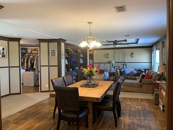 2013 Clayton Doublewide surrounded by more than 19 acres in the country! 4 bdrm/2bth with open living/kitchen/dining & den w/ wood-burning fireplace. Huge laundry room with sink & room to hold an extra refrigerator & freezer. Deck added w/ electricity. Master bdrm has double doors leading to master bath, boasting his/her vanities, tub, separate shower, & walkin closet. Shed for animal pens &/or to store your mower. This one will be gone fast!