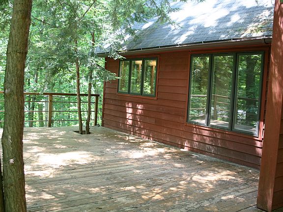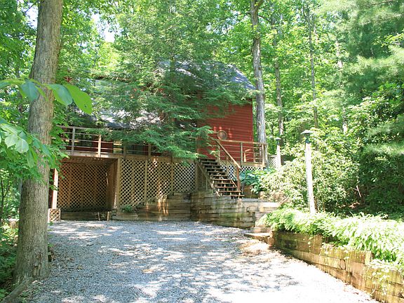 Northwest meets Southeast. This redwood-sided contemporary home has all the ambience of the Pacific Northwest combined with the rich and varied flora/fauna that’s specific to Southeast Ohio. What a great mash-up! Privately situated on an easy-to-care for 4+ acres, a lovely and meandering driveway snakes past towering trees and developed landscaping beds—first to huge garage/workshop—and then on to a tidy and unassuming 2 ½-story home. The main picture on our website actually shows the rear of the house, because the front is so surrounded by woods that it’s hard to catch a glimpse of it! There are even mature hemlocks growing through cut-outs on the deck. String a hammock there and call it a day. Or, come inside: the main living area features cathedral ceilings with a bank of skylights, a larger first-floor bedroom with adjacent bath, a big & open cook-friendly kitchen with gobs of counter space and cabinets, and— best of all—easy access and nice views of the sprawling, multi-layer deck and woods out back. Upper level has 2 more bedrooms and a shared bath, and the lower level boasts a large laundry room (with ½ bath), storage area, and a walk-out family room with wood-burning stove. Other features include an over-sized 2-car garage plus a large workshop, established garden and landscaping beds, rain barrels, trails, fish pond, and more. Inside or out, this unique home offers a healthy dose of calm. Come find your serenity on Hudnell Road!