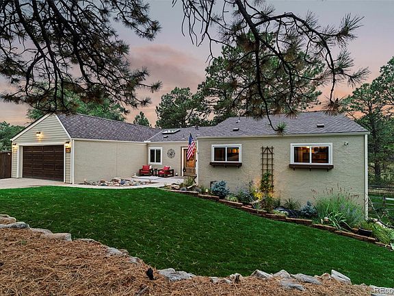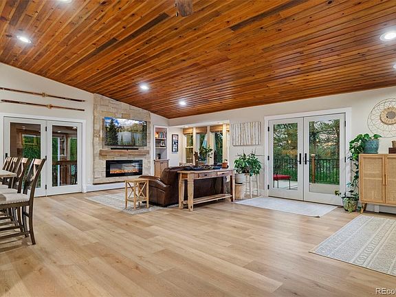 Experience refined living in this beautifully updated ranch home with a fully finished walkout basement, ideally located on a private cul-de-sac in The Pinery. Set on nearly half an acre, this 4-bedroom, 4-bath residence offers 4,363 total square feet of thoughtfully designed living space. The light-filled great room impresses with vaulted plank ceilings, wide-plank flooring, and a dual-sided wood-burning fireplace with stacked-stone surround. The two-story sunroom—with an indoor hot tub and outdoor access—invites year-round relaxation. The gourmet kitchen features leathered granite counters, a massive island, 42” cabinetry with under-cabinet lighting, a skylight, and a breakfast nook. The private primary suite boasts a slatted accent wall, two-sided fireplace, dual walk-in closets, and a spa-style bath with dual shower heads and seamless glass enclosure. The finished walkout basement adds exceptional versatility with a large recreation room, wood-burning stove, private guest suite, ¾ bath, and a spacious bonus room with exterior access—plus abundant storage throughout. Outdoor living shines with a 31’ x 14’ composite deck, lower-level covered patio, gazebo with wood-burning fireplace and TV, and a beautifully landscaped yard surrounded by mature trees. Additional highlights include a two-car garage, mudroom with built-ins, and fenced RV/boat parking. Just minutes from The Pinery Country Club, award-winning schools, shopping, and dining—this home perfectly blends privacy, functionality, and timeless Colorado charm.