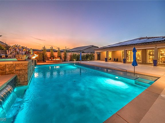 Take advantage of this opportunity to own a stunning, upgraded, single-story Julia Model by Richmond American, located at 6177 Lautman Ridge Ct in Highland Hills. Set on a spacious corner lot, this home offers 2,990 sqft of luxurious living with 4 bedrooms, 3 baths, and a 3-car garage. The gourmet kitchen features Taj Mahal countertops, a crystal onyx backsplash, Monogram stainless steel appliances, and a custom butler's pantry with a sink and dishwasher. The open floor plan flows seamlessly into the living room, with sliding glass doors that lead to the stunning backyard and offer breathtaking mountain views—ideal for indoor/outdoor entertaining. Step into your private backyard oasis, featuring an 894 sq ft. pool and spa. Enjoy dazzling water and fire features, an outdoor BBQ, and a covered living area with a bar and fireplace. With cool decking and lush mature landscaping, this space is truly an entertainer's dream come to life! This home includes paid-off SOLAR PANELS at the COE.