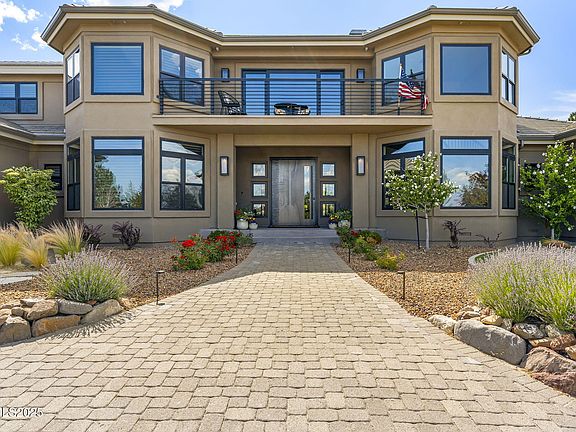 Step into 6177 North Featherstone, a residence reimagined from the ground up to embody the sophistication of design & the effortless grace of High Desert living. Nestled within the prestigious ArrowCreek community, this fully remodeled estate offers 5,586 square feet of inspired living on a full acre. With sweeping views across the Sierra Nevada & Mt. Rose mountains, lush golf fairways, & sparkling city lights, every angle of this home tells a story of elegance & connection to its surroundings. The owners began their remodel with purpose: to create a seamless flow, where form meets function & every detail enhances life, leisure, & entertaining. Walls were softened, pillars removed, & spaces reimagined to capture natural light & open sightlines. Modern finishes & thoughtful design balance grandeur with comfort. A finished basement & upstairs library added 312 square feet, expanding versatility without sacrificing intimacy. Arrival makes an unforgettable impression with a custom 9x6 steel pivot door by Modern Steel Doors of Arizona. Inside, a light-filled foyer leads to an expanded balcony, where sweeping golf course & city views set the stage for sunrise coffee or starlit evenings. At the heart of the home, the Dining Room has been elevated into a dramatic entertaining space with soaring two-story ceilings & a two-sided fireplace connecting indoors & outdoors. Andersen sliding doors open to patios & gardens, while striking Sonneman fixtures & art lighting create ambiance. Whether hosting holidays or intimate dinners, the space adapts with ease. The Main En Suite is a private retreat, complete with custom California Closets, cove lighting, & remote-controlled Hunter Douglas shades. The spa-inspired bath showcases a freestanding soaking tub beneath chandeliers, a dual-entry steam shower with rain head & sprayers, natural stone floors, shimmering glass tile, & custom cabinetry with quartz counters & lighted mirrors. The Great Room centers on a custom travertine fireplace with black quartz mantel, complemented by wood-grain tile floors, a Minka Aire fan, & integrated Sonos audio. The Kitchen & Nook feature a Wolf 48" range, Sub-Zero refrigerator, & a central island with seating. The Games Room delights with Hubbardton Forge lighting, speakers, & motorized shades. A dramatic staircase of black-stained oak & iron railings rises beneath a cascading Sonneman chandelier. Upstairs, the new Library offers custom bookcases, club seating, & a 12-foot Andersen glass wall opening to a balcony with panoramic views. Four additional en suite bedrooms provide privacy, storage, & character. Outdoors, multiple patios, a two-sided fireplace, & landscaped grounds enhanced with solar lighting create serene gathering spaces. Modern systems include central HVAC with three units, radiant heated floors, Tesla solar panels, Cat-6 wiring, Sonos audio, & a four-car garage with EV charger. This estate is more than a home—it is a lifestyle. From morning coffee on the balcony to wine in the library at dusk, from quiet family nights to grand celebrations, this residence harmonizes elegance, comfort, & versatility. Every space has been thoughtfully crafted, every view a reminder of Reno's beauty. This is a rare opportunity to own a fully realized vision of home, where luxury & ease coexist seamlessly.