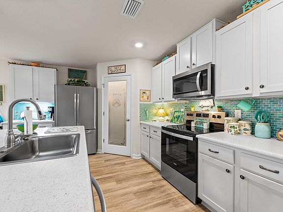 You are going to fall in love with this CHARMING beach style cottage and it is just 2 YEARS young! There are so many recent UPGRADES that have been done to make this home truly a ONE-OF-A-KIND custom Florida themed home! There is a WELCOMING entryway into the home and the four bedrooms are arranged in a split plan with the PRIVATE master suite located in the back of the home. The kitchen is OPEN to the living and dining area, with beautiful ENHANCEMENTS throughout INCL: light fixtures, ceiling FANS, a GLASS pantry door, mosaic TILE backsplash, QUARTZ countertops, DEEP stainless steel kitchen sink, brushed nickel kitchen faucet, cabinet door HARDWARE and NEW interior doors. The bathrooms have also been UPGRADED with new light fixtures, quartz countertops, and cabinet hardware! Exterior enhancements include a covered front porch with a wood custom railing, wood custom shutters, front entry door, cedar shaker style vinyl siding, a screened-in back patio, exterior light fixtures, double-sided shadow box privacy fence, weathervane and landscaping. The kitchen appliances, washer, dryer, camera security system, termite warranty, and upgrades are included for the new owners to enjoy!