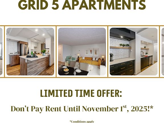 AboutGrid 5 is a centrally located high-rise apartment building in downtown Calgary that offers great views of the city. Located nearby are pubs and eateries on every corner. Our spacious apartment suites for rent provide residents with access to a fully-equipped fitness centre, laundry facilities and an expansive outdoor pool deck. For peace of mind, Grid 5 offers the advantage of on-site security, as well as security cameras.Grid 5 offers the ultimate urban lifestyle in downtown Calgary with its central location, first-rate amenities, conveniences, luxury and affordability.
