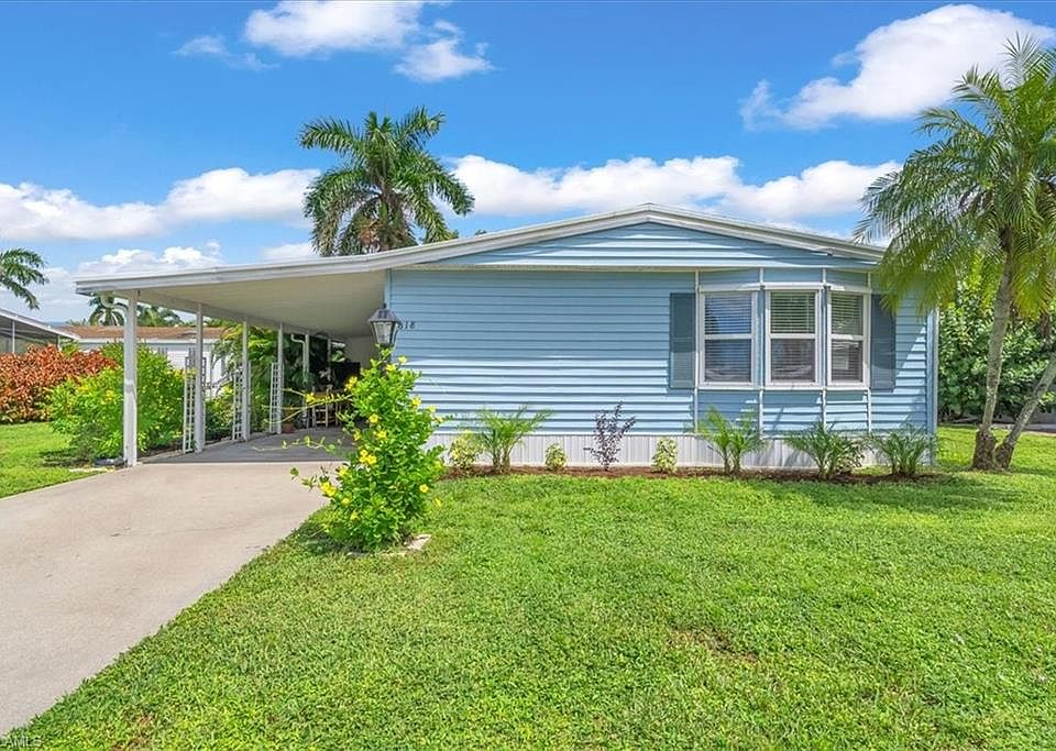 Do not miss this opportunity - extensive updates, light and bright home in the popular 55+ community of Riviera Golf Estates with low HOA's. Yes! You own the land! New SHINGLE roof 2020, all new windows 2021, entire skirting completed September 2025. Underneath foundation completely redone September 2025, including anchor tie downs, leveling and lifetime warrantied vapor barrier. New washer & dryer & refrigerator 2024, luxury vinyl plank flooring & new plywood under in 2024. Updated guest bathroom, and freshly painted large primary bedroom. Vaulted ceilings in a light filled great room, with a dining area and built in cabinets just off the kitchen. The great room opens out to a large Florida room where you have views of the open landscaped backyard area, very private. Kitchen is updated with newer stainless steel appliances, and great flow to the rest of the home. Outside sitting areas, gardens to view, and a spacious storage shed with washer and dryer located within the carport area, feels like an extension of the inside! Very friendly community featuring a newly done saltwater pool, with lap lanes, many social activities in the clubhouse. Enjoy the fitness and billiard rooms, pickleball, tennis, bocce and shuffleboard! All of this located just 15 mintues from the famous 5th Ave restaurants & boutiques and the gorgeous Gulf beaches!