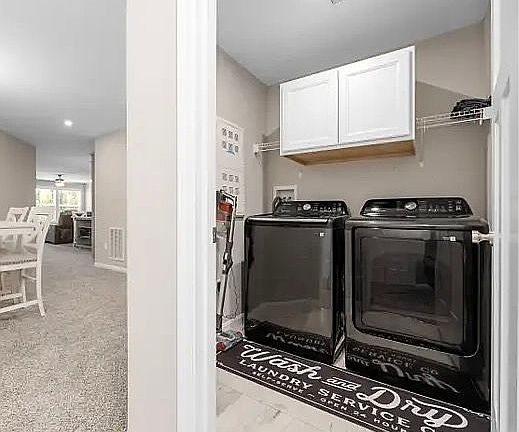 *A second full bath is conveniently located near the guest bedroom and in-unit laundry area — washer, dryer, and a new supply cabinet included.