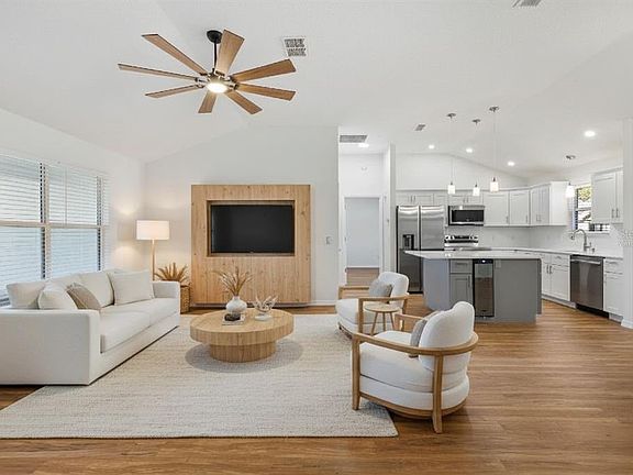 One or more photo(s) has been virtually staged. "Better-Than-New" Bougainvillea — NO BOND! This beautifully fully remodeled home is perfectly located between Lake Sumter Landing and Spanish Springs Town Squares, offering convenient access to golf, shopping, dining, Tierra Del Sol Country Club, and the Tierra Del Sol Theater. Step inside and be the first to enjoy a brand-new kitchen with a redesigned island providing additional storage and a built-in beverage cooler, plus new appliances and soft-close cabinetry throughout. The home features luxury vinyl plank flooring with zero transitions for a seamless, modern look, along with Smart Home upgrades including a WiFi-enabled ceiling fan, USB charging outlets in the primary bedroom, and hidden power outlets in the master bath vanity drawer. Both bathrooms have been completely remodeled with stylish finishes. Situated on a desirable corner lot along a cul-de-sac street, the home is surrounded by mature shade trees and offers quick and easy access to Morse Boulevard via the San Marino Drive stoplight. Major updates include a Roof (2020), HVAC with UV Sanitizing Light (2019), and Water Heater (2021). This move-in-ready Bougainvillea offers the comfort and style of a new home without the bond — truly a must-see property in The Villages!
