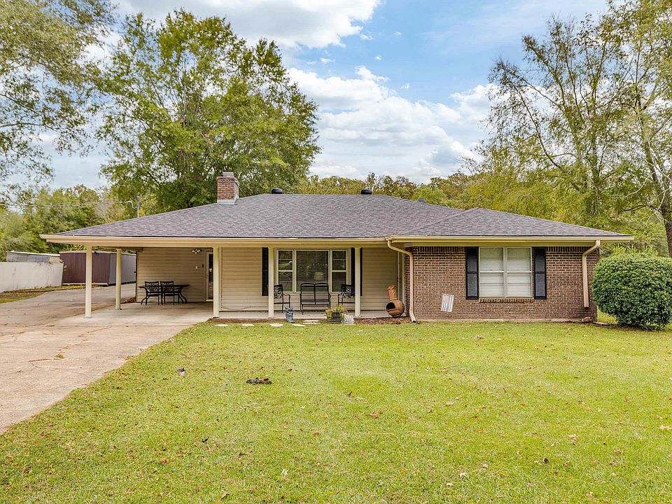 Welcome home!! This spacious property sits on one acre and features a one-car covered carport, covered front and back porches, and great outdoor amenities including a storage shed and RV hookups. Enter through the carport directly into the kitchen, which offers abundant cabinet space, generous countertops, and an open layout that flows into the dining area and large living room. The living room features built-in bookshelves, a brick fireplace, and a large window that fills the space with natural light while overlooking the covered front porch. The dining area opens into a versatile flex space, perfect for a home office or playroom, with French doors leading to the covered back porch and backyard. Just off the kitchen is the laundry room, complete with a walk-in pantry and a convenient half bath. Down the hall are two spacious bedrooms with walk-in closets, a full bathroom, and access to the covered front porch along with an additional storage closet. The primary suite includes rolling barn-style closet doors to a walk-in closet, plus an en suite bathroom featuring a large stand-up shower, a double-sink vanity, and a second oversized walk-in closet with built-in shelving and drawers. This beautiful home combines country charm with functional living space — ready for you to move right in and enjoy!!!