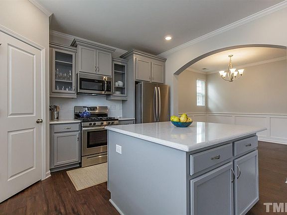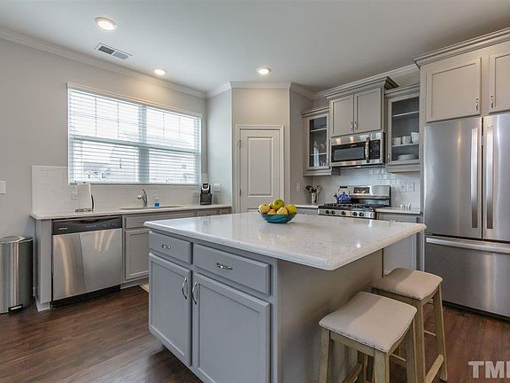 Welcome home! Ideal living space features 9' ceilings, LVP floors on main, spacious kitchen w/ oversized island, level 3 upgraded granite, glass accent door cabinets, stainless steel appls & classic backsplash. Study on main; 3 add'l bedrms + LOFT + laundry on 2nd. Walk-in shower + tub in master. Gas FP, 2 car garage, recessed lighting thruout; All appliances can convey, move-in ready. Walk to playground & pool! Centrally located w/ convenient access to Hwy 70, 98, 147 I-40, 540, & 20 min drive to RDU!
