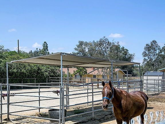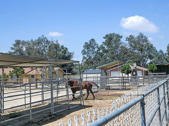 Welcome home to this charming single story ranch on almost an acre lot! Built in 2008 this home has it all! 3 bedrooms, 2 baths open floor plan family, dining and kitchen area. Vaulted ceilings and wood burning fireplace in the living room. Dual paned windows and doors throughout. The kitchen features plenty of cabinet and counter space and gorgeous views out back to your horse corrals and arena. Out back enjoy your white grapefruit and bitter orange trees, as well as fruit producing white seedless grape vines and a flowering but fruitless apricot tree. Or step into the front yard if dark red mulberries are more to your taste. This horse property features a 50 x 100 foot arena. Configuration for two to three horse stalls/corrals sized 24x24 to 24x36 as well as 8x12 covers included in the sale. The corals are 4 or 5 rail pipe panels, minimum height 5 feet with horse trailer access to arena as well as separate concrete parking pad. Capability to park two trailers on the parking pad. This home is also solar "ready" with a built in smart reader. - just need to add the solar panels. Additional side gate at driveway allows for easy propane delivery access. If you are looking for a fabulous horse property this Ranch style home built in 2008 has it all! Buyer to Verify: All water and electric lines to the pool were disconnected when the house was built in 2007.