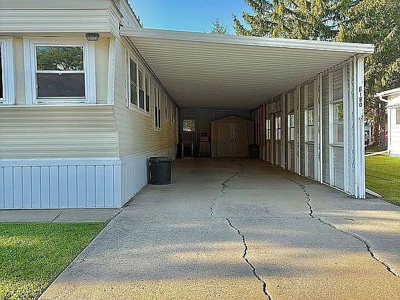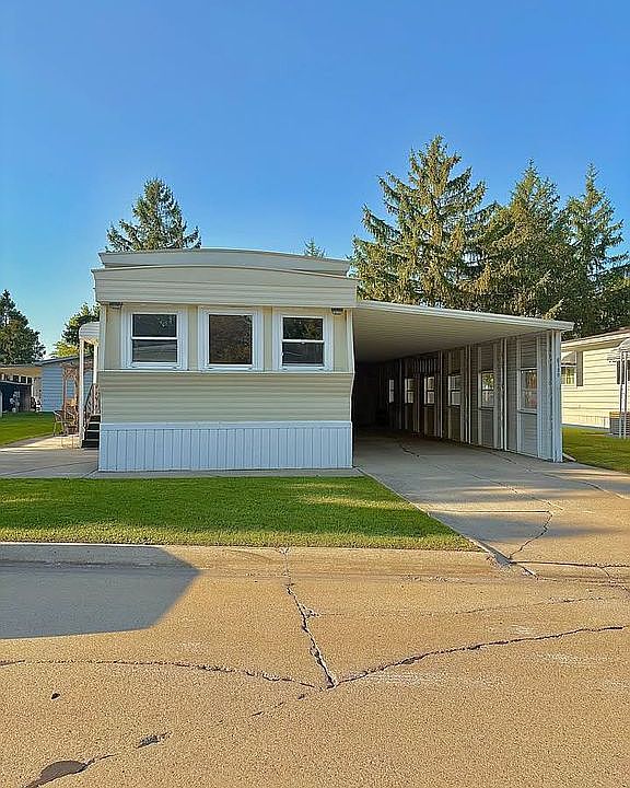 Charming 2 bed, 1 bath single-wide (980 sq ft, 70x14ft) with carport, located on the main boulevard. Enjoy community perks including a pool, golf course, basketball courts, and park!