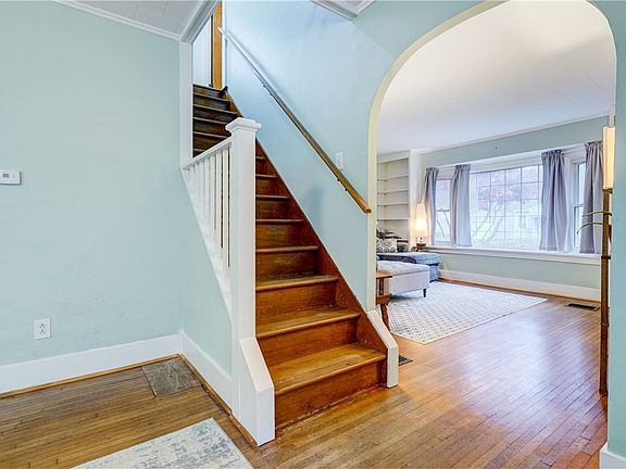 Upstairs, you’ll find two generous bedrooms and a full bath with a double-sink vanity. A practical rear mudroom adds everyday convenience — perfect for Rochester winters. Step outside to a large entertaining deck, perfect for summer barbecuing, overlooking the massive back yard. Mature trees and a stream in the back of the lot provide a serene retreat; ideal for pets, hobbyist gardening, or simply relaxing. The sturdy detached garage is an ideal storage or workspace.