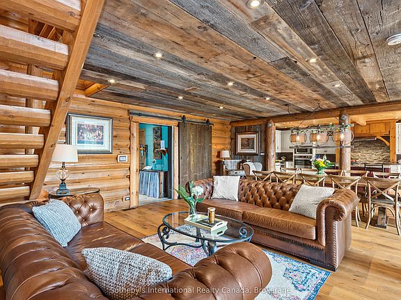 Welcome to your dream waterfront retreat in Crystal Bay on Go Home Lake! This stunning winterized Golden Eagle log home boasts 3 bedrooms, 3 bathrooms, and 2,642 square feet of luxurious living space. Step inside and be captivated by the beauty of the 10" white Wisconsin pine logs that frame the home. Accessed by boat, you are under 10 minutes from the marina. Enjoy the serene ambiance with 558 feet of water frontage, set on a spacious 1.56-acre lot. The southeast exposure fills the home with natural light, creating a warm and inviting atmosphere. The main floor features a stunning ledge rock fireplace in the spacious living room while the dining room offers ample seating for gatherings. The gourmet kitchen is a chef's delight, equipped with stainless steel appliances, a moveable island, granite countertops, and a beautiful stone backsplash. The spacious primary suite boasts a walk-out to the deck, complete with an ensuite that includes a jacuzzi tub, custom granite shower, and double sink. The attention to detail is evident with custom stonework throughout. Rounding out this level is a bathroom designed to resemble an outhouse, adding a unique touch to the home and a convenient stackable laundry pair. Upstairs, the loft area overlooks floor-to-ceiling windows, creating a cozy retreat. Here you will also find two generously sized bedrooms with vaulted ceilings and a 4-piece bath that provides comfortable accommodations for family and guests. This home is beautifully furnished throughout, showcasing quality furniture and log beds that perfectly complement the rustic charm. Outside, the tastefully landscaped property features a flagstone front yard, a tiki bar on the dock, and a sand beach area creating the ideal space for outdoor entertaining. Relax and enjoy the soothing sounds of your own personal waterfall. The adjacent property is also for sale, offering the potential for a family compound, complete with a spacious 3 bedroom log home (see MLS # X12016866).