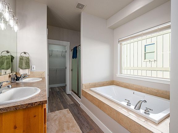 Checks every box without feeling ''boxy.'' Quick-to-everything SE Bend—Reed Market Crossing, Whole Foods, parks—this roomy home + lot offer space to live, work, stash gear—and host. Main-level living done right: oversized primary suite (soaking tub, dual vanity, toilet closet, separate shower, big walk-in), breakfast-bar kitchen: black leathered granite + pantry, a powder bath, and a true two-car garage. Built to last + relax: durable cement board siding, easy-care landscaping with sprinklers. Out back: a privacy-fenced yard with covered dining patio, pup/kid lawn, and an RV-ready private rear driveway. Upstairs keeps delighting: huge flex landing w/ Pilot Butte views (hello, fireworks), 3 bright bedrooms, full bath w/ dual vanities, plus an oversized laundry—right where you want it. Fresh updates: full exterior/interior paint; new flooring/trim, hardware, lighting, granite, undermount sink, and fridge. Starter w/o compromises—or a strong LTR/MTR hold. This is the one you won't outgrow.