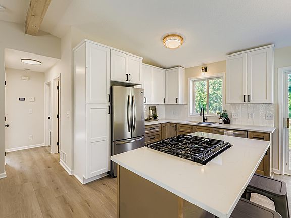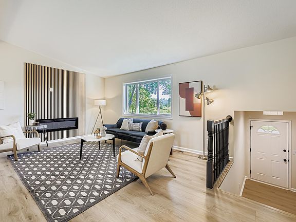 Built in 2000, this updated 4-bedroom, 2-bath home with a 3-car garage sits on a spacious corner lot across from a park. Inside, enjoy quartz countertops, Frigidaire stainless steel appliances, and soft-close custom cabinetry in a bright, functional kitchen with center island and adjacent dining. Vaulted ceilings, a statement wood beam, modern fireplace, and recessed lighting create a warm, elevated living space. Both bathrooms feature matching cabinetry and updated lighting. The lower level includes two bedrooms, a family room with accent wall, and extra storage. With trails, open green space, and few direct neighbors, this home blends comfort, updates, and room to make it your own.