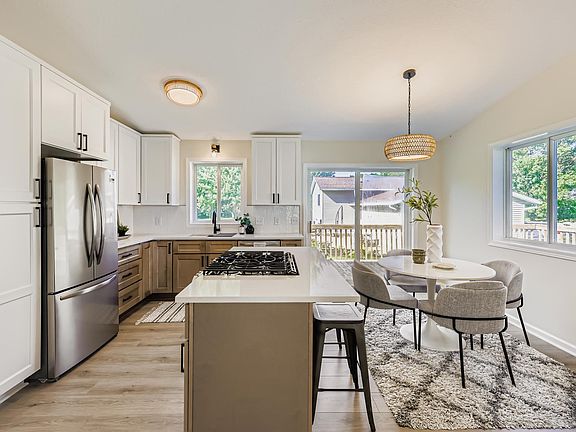 Center islandExtra storageModern fireplaceVaulted ceilingsStainless steel appliancesUpdated lightingRecessed lighting