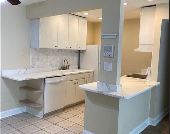 New sleek quartz countertopsSouth exposureBeautiful kitchenPass-through windowMosaic backsplashOpen sunny interiorVinyl plank flooring