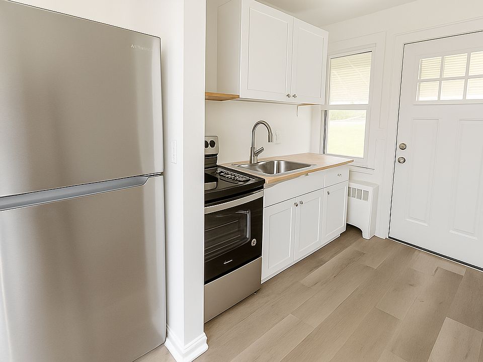 JUST RENOVATED! New flooring, new kitchen cabinets counters and appliances, new bathroom appliances, new HVAC with air conditioning, freshly painted. Private end unit apartment with lots of natural light and an outdoor area.