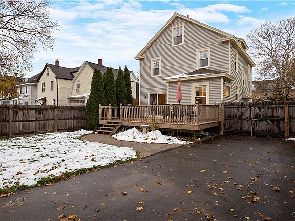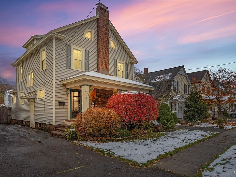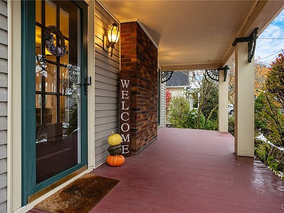 Elegant Sedgwick Dutch Colonial in the Heart of the Preservation District. Step into timeless sophistication with this stunning Colonial, where 1930s craftsmanship meets modern comfort. From its gleaming hardwood floors to its wrought iron staircase railing and arched doorways, every detail reflects pride of ownership and classic charm. The welcoming living room spans the full width of the home and features a brick fireplace flanked by built-in bookcases, leaded glass window, and graceful architectural details. The large formal dining room—complete with an original built-in corner cabinet and sliding doors to the deck—offers the perfect space for entertaining. The updated kitchen combines functionality and style, featuring newer countertops, a subway tile backsplash, stainless steel appliances, and ample storage. A convenient half bath completes the first floor. Upstairs, the vaulted owner’s suite is a serene retreat, boasting exposed brick and beams, a loft area, and double closets. Two additional bedrooms and a finished third-floor walk-up—ideal for a guest room, office, or game room—offer plenty of flexibility. Recent updates include a new roof (2020, fully stripped), water heater (2021), vinyl siding, replacement windows, and fresh paint throughout. Outdoors, enjoy the inviting front porch, spacious rear deck, and fully fenced yard with lush landscaping, brick paver walkways, and a raised garden bed. A one-car detached garage completes this picture-perfect property. With nearly 1,600 square feet of living space, this exceptional home blends vintage character with thoughtful updates—creating a warm, welcoming haven in one of Syracuse's most sought-after neighborhoods.