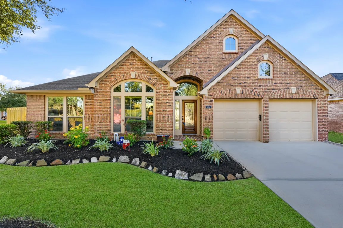 Welcome to this beautiful brick home on a corner lot.Step inside to the extended entry with 12-foot raised coffered ceiling.A private home office is at the front of the home, providing a quiet space for work or study.The generously sized dining room is ideal for hosting, offering space for an 8-person ...