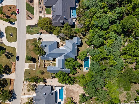 Magnificent One-Story Custom Home in Menger Springs Built by S. Barry Signature Homes at 619 Menger Springs, Boerne, TX 78006, Nestled against a private reserve creek loaded with various trees creating a tranquil private setting! This is the Builders personal Estate with private entry that secures garage and backyard, With 5928 SF, 4 car Garage, 4 Bedrooms, 4.5 Baths, 2- Study's and workout-flex room. The Home was built with Smart technology with Control 4 system with 5 in wall Ipads that control audio, security, lights, alarm and cameras. The energy efficiency of this home includes: 100% Rock, full foam insulation, standing seam metal roof, tankless water heaters, and 5 damper HVAC system. This Home offers unsurpassed craftsmanship and materials harmoniously combined to create exquisite living spaces. Designed with only the finest appointments throughout to include travertine / wood flooring, exotic stones and granites, Alder millwork, custom ceiling details, upgraded light fixtures and plaster finished walls. A chef's kitchen with Thermador appliances, custom solid wood cabinetry and large granite island and built in Wolf coffee maker. A luxurious Primary suite boasts a spa-like bathroom with natural lighting flooding through the atrium. Single story living with spacious guest bedrooms, large closets. Enjoy unsurpassed privacy outdoors with a sparkling 40,000 gallon pool and spa with full outdoor kitchen. The backyard boasts 2 Peach trees and one lemon tree and views of the Greenbelt. The garden outside the kitchen allows for fresh grown vegetables and herbs. The family room opens to the gourmet kitchen and an oversized island offers bar stool seating. An exemplary offering within the prestigious Menger Springs, Boerne, Texas.