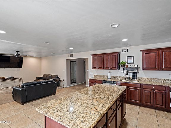Welcome to this beautifully updated Mesa home on a spacious irrigated lot with no HOA. Major updates include a new roof (2021), 14 SEER A/C (2022), and a 200 amp electrical panel upgrade. Energy efficiency shines with dual pane windows at the rear, Energy Star windows at the front, and owned solar (paid off at closing). The remodeled kitchen features granite countertops, a breakfast bar, and ample cabinet space, opening to the living area for comfortable gatherings. Step outside to enjoy a PebbleTec pool (refinished 2018), covered patio, and a large backyard with RV gate and RV parking. Conveniently located near Downtown Mesa, Riverview Park, Sloan Park (Chicago Cubs spring training), Mesa Riverview shopping, Tempe Marketplace, and the light rail.