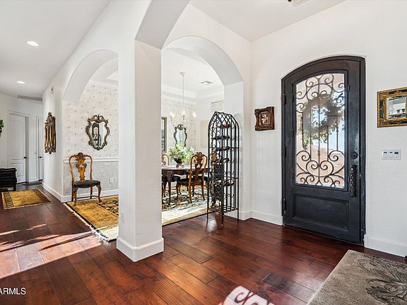 Step into storybook curb appeal and sweeping mountain vistas in this beautifully upgraded 3 bed, 3.5 bath single-level home. The well-designed floor plan flows effortlessly, showcasing top-of-the-line lighting fixtures, pristine Smoke Bourbon hardwood flooring, and custom architectural details including dramatic coffered ceilings, elegant arches, and upgraded window treatments. A spacious, window-lined great room anchors the home with a custom stone fireplace—perfect for cozy evenings and entertaining. The gourmet kitchen is a dream with rich designer cabinetry, custom granite counters and backsplash, new dual ovens, and new stainless steel appliances. Enjoy the outdoors from your beautiful patio featuring picturesque views of the Superstitions, a sparkling pool, & brand-new hot tub for ultimate relaxation. Located in a gated community offering added peace of mind and a welcoming neighborhood feel. This home is truly one-of-a-kind luxury, comfort, and views that will take your breath away.