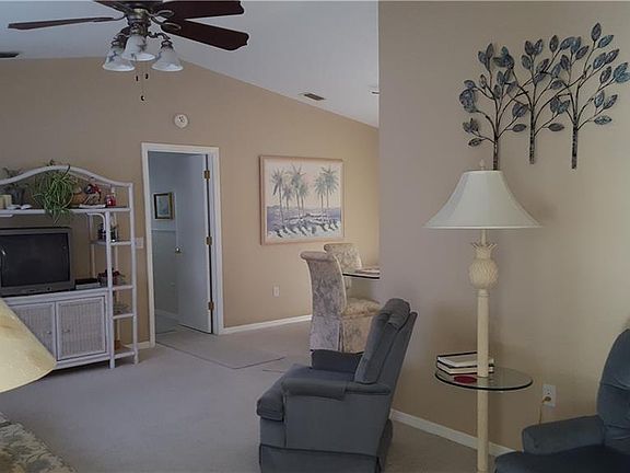 Offering a furnished 3 bedroom, 2 bath, 2 car garage home in North Port that's ready for you to call it home. Light and bright home offers a split bedroom floorplan, with an eat-in kitchen and L-shape living room/dining room combination featuring cathedral ceilings. You'll find neutral colors, coastal décor and pride of ownership. Floors are carpeted in the living room, dining room and bedrooms, and tile in the kitchen and bathrooms. Washer and dryer are located in the garage which also has a workbench and storage cabinets. Conveniently located near restaurants, shopping, library, medical offices and just a short drive to the future home of the Atlanta Braves spring training stadium.