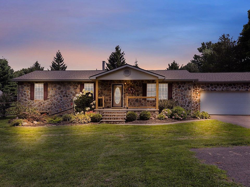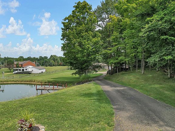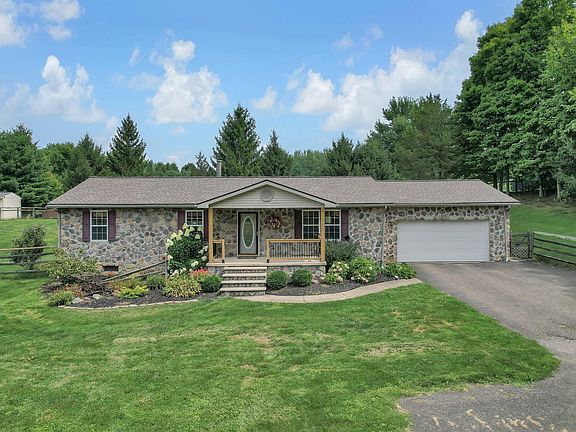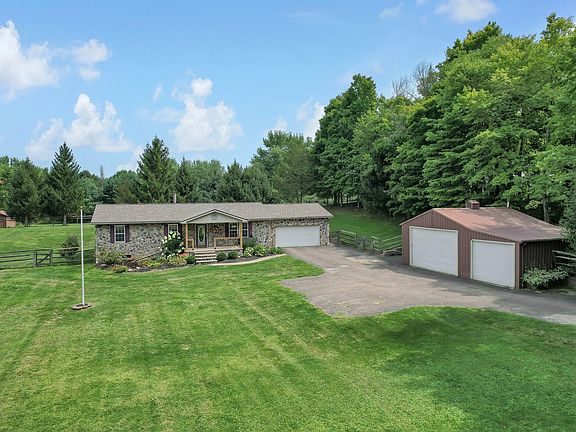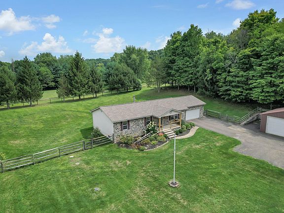 Welcome to this updated, well-maintained three bed, two bath ranch on 1.57 acres in the Johnstown-Monroe school district. This property is lined with fencing, is partially wooded, and has a stocked pond. Several major updates include: new roof '19,new kitchen appliances '21, new water softener/conditioning system '21, geothermal system '21, water heater '23. There are beautiful hickory-wood floors throughout most of the main floor.Enjoy coffee on the front porch looking out over the large front yard and pond. The full basement is partially finished and has plenty of room for a home office,craft room, or play room! A two-car detached garage has electric and an automatic garage door opener. Immediate possession!