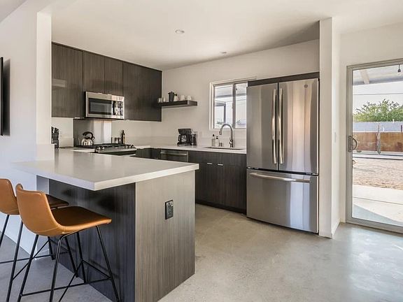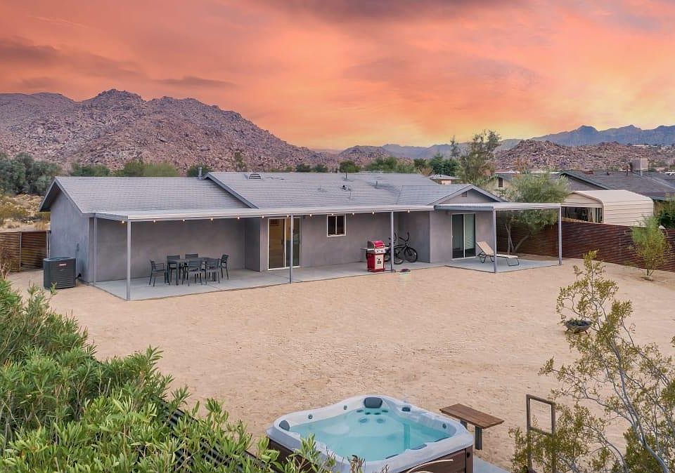 This home is a two-bedroom, one-bath guest cottage conveniently located within walking distance of the Joshua Tree Village and just minutes away from the west entrance to the national park. Recently renovated, this home is a peaceful get-away yet right in the heart of everything. In the kitchen, you'll find a gas stove, oven, fridge, and freezer. Extras include a kettle, a drip coffee maker, a French press, a blender, and toaster. Whip up a quick breakfast before a hike or cook a romantic dinner to enjoy as the sun sets. Inside, the dining table seats 4, and there's a breakfast bar with 2 stools. Or, opt for al fresco dining around the firepit. The patio behind the house includes chairs, a BBQ and brand new Jacuzzi brand hot tub. Highlights include: Lovely back patio with grill and lots of seating Brand new Jacuzzi brand hot tub Fully equipped kitchen Bocce Ball Court & Propane Fire-pit EV Charger & Garage 2 private bedrooms / 1 bathroom Off-street parking Walking distance to shops + dining in Joshua Tree Village 10-minute drive to the Joshua Tree National Park west entrance High-speed Spectrum Internet service of up to 200mbs/sec Professionally hosted by Homestead Modern This property is available to rent Now - Nov 30th. All utilities and water feature maintenance included, up to 2 dogs OK with pet fee. NO cats. This home is available because of some short term construction work happening mid august- end of October, give or take. The contractor will be building a pool and will only be working during the week in the backyard. With pool construction - there are only a few days where there is a lot of construction noise. Management will communicate with renter about major construction events