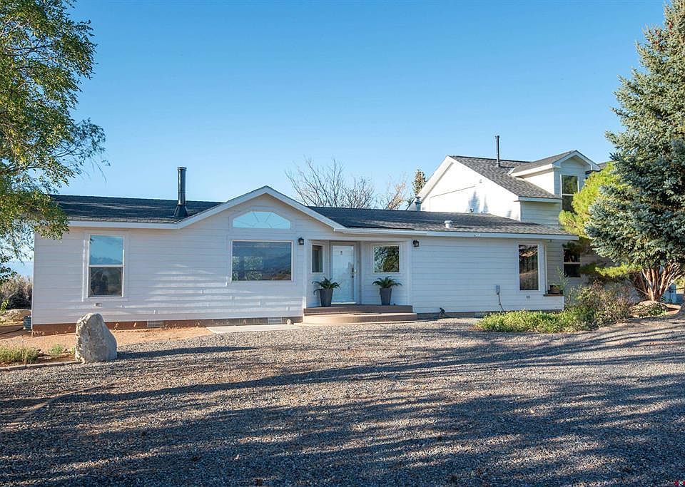 Discover space, comfort, and incredible views with this beautifully updated 2002 manufactured home on a permanent foundation, set on 6.07 scenic acres. With 2,150 sft of living space, this property offers a perfect blend of modern upgrades, versatility, and rural charm. The kitchen is bright with a good amount of cabinet space, solid surface countertops, complete with a generous pantry and a cozy breakfast nook. The kitchen, breakfast nook, dining room, and entry have beautiful tiled floors for easy cleaning and maintaining. The living room features a gas fireplace that provides ambiance and making it the perfect gathering space. The main floor also features 3 spacious bedrooms and 2 updated bathrooms, each remodeled with custom tile work around the showers and tubs for a touch of elegance. The main primary suite is spacious. The bathroom features 2 sinks, ample countertop space with vanity area and a tiled walk-in shower. Above the oversized two-car garage sits a private second primary suite — a wonderful retreat or guest space — complete with its own freestanding gas stove and mini split system for year-round comfort. There is also an abundance of closet and storage space here as well. If you love spending time outside, you will enjoy unobstructed views of the southern San Juan Mountain Range and the Grand Mesa to the north from this serene property. The land offers ample room for additional parking — ideal for campers, boats, and recreational toys — fruit trees and even space to keep a few farm animals if desired. This is the perfect property for those seeking peaceful country living with room to breathe, modern updates, and panoramic Colorado beauty in every direction.