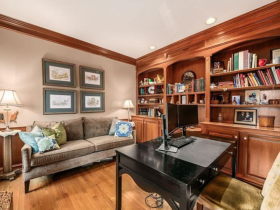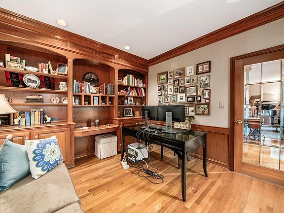 granite countertops and double ovens. Opens to a generous deck overlooking a water feature with 2 ponds; custom paver fire pit w/ electrical outlet; and a walkout from the basement. First floor has a private den/office space, separate dining area, & laundry room. Front and back staircases lead to 4 bedrooms including the owner suite w/ large walk-in closet; private bath w/ 2 sinks; walk-in shower; and jacuzzi tub overlooking the quiet backyard. Total of 4 garages. 2-car attached garage as well as a 2-car detached. Inground irrigation system.