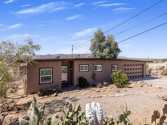 PRICE IMPROVEMENT! Tucked away on an elevated lot with views of Joshua Tree National Park and Mt. San Gorgonio, this charming 2-bedroom, 1-bath home offers comfort, style, and a strong investment opportunity. The kitchen features newer granite countertops, a trendy corrugated tile backsplash, and an enviable walk-in pantry, while the adjacent dining area is filled with natural light—perfect for everyday meals or casual entertaining. A cozy living room anchors the home with its custom rock wall and windows that frame the property’s impressive southerly vistas. The large primary bedroom includes a walk-in closet and its own Mitsubishi mini-split system, while the second bedroom makes a great office or guest room. The bathroom is updated, and the home includes new plumbing, fresh interior and exterior paint, and new ceiling fans throughout. The two-car garage features a laundry area and a brand-new electric garage door. Outdoors, the fully fenced yard is ideal for pets and showcases a mix of native and mature plantings—acacia, mesquite, olive, tamarisk, ocotillo, beavertail, agave, prickly pear, and desert willow—as well as a custom desert rock wall with built-in planter. Surrounded by open land, the property offers privacy, sunset views, and a true desert escape. Additional highlights include natural gas appliances and high-speed internet. Located within walking distance to downtown Joshua Tree, the library, and local coffee shops, this home is a wonderful full-time residence, weekend retreat, or solid rental investment. Schedule your showing today!
