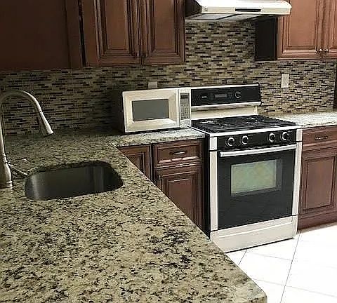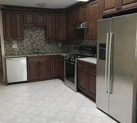 The first floor offers a spacious living area, a modern kitchen with granite countertops, cherry wood cabinetry, a skylight, and recently updated appliances, as well as a bedroom and full bathroom. Upstairs, you'll find two additional bedrooms, another full bathroom, and a laundry room with a washer and dryer. The master bedroom includes a walk-in closet, and the thoughtful layout ensures that all three bedrooms are well-separated for maximum privacy.