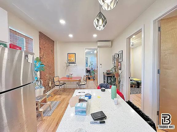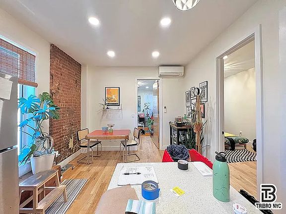 This modern apartment features a thoughtfully designed kitchen with top-of-the-line appliances, including a dishwasher, plus split units in every room for year-round comfort. Exposed brick walls bring timeless character, while oversized windows fill the home with natural light.