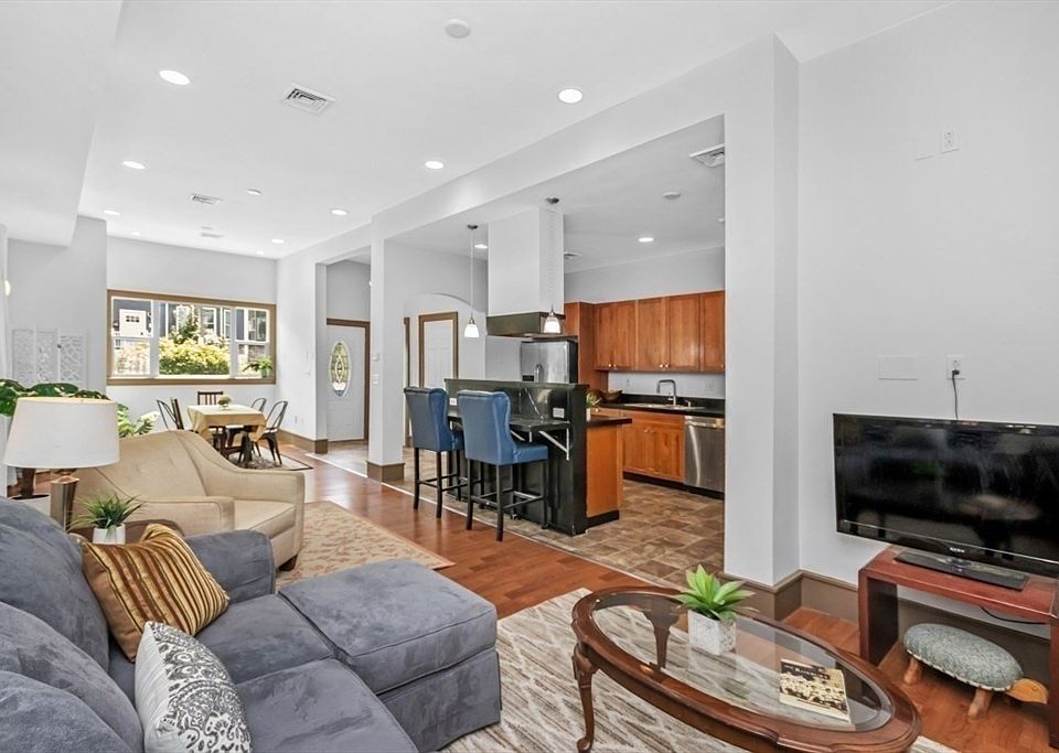 Rarely available spacious townhouse with 3 levels of living and 1,845 square feet. Nestled on a side street, it features high ceilings giving a grand sense of space with an open floor plan, recessed lights, stainless steel appliances, central AC, and 2 parking spaces including an attached garage. The 2nd level offers two sizable bedrooms, a bonus space, perfect for an office, a full bath with laundry and a large deck. The third floor offers a master bedroom with dual closets and a modern ensuite bath. Conveniently located near shops, parks, restaurants, public transportation with easy access to downtown and highways. Enjoy the best of Roxbury living!