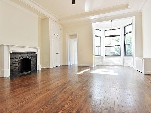 Spanning the entire width of the building, the grand living room measures ~19' x 19' and expands to 24' where the most charming, south-facing bow window forms a semi-circular alcove, an ideal spot for a dining area or a separate home office. Restored prewar details include a tray ceiling, a decorative fireplace, and various moldings. Originally the expansive master bedroom of a sprawling 5-story mansion, the living room is open, airy, full of charm, and a great space for entertaining.