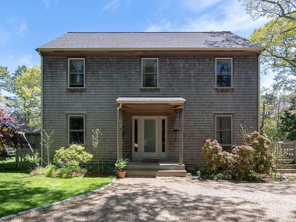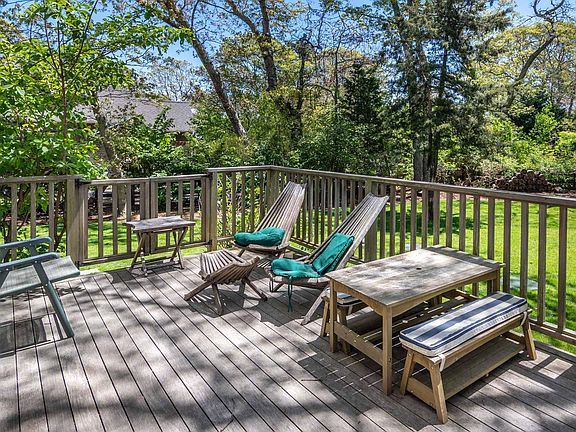 The covered front porch welcomes you to this custom built home in Oak Bluffs. Step into the spacious living room with wood stove, hardwood floors and lots of natural light. The beautiful kitchen offers tiled floors, ample cherry cabinets, granite counters with center island, stainless steel appliances, and custom built breakfast-nook for dining. The powder room off the center hallway completes the first floor. Upstairs you will find a large master bedroom with en suite bath and walk-in closet along with custom built-ins for storage. There is an additional bedroom with en suite bath and office/den. The lower level is partially finished with TV/Lounge area and bar for entertaining along with laundry area and great storage. House has central AC. Completing the property is the professionally l