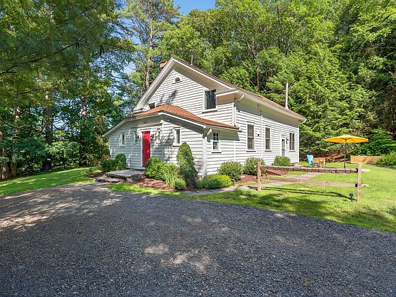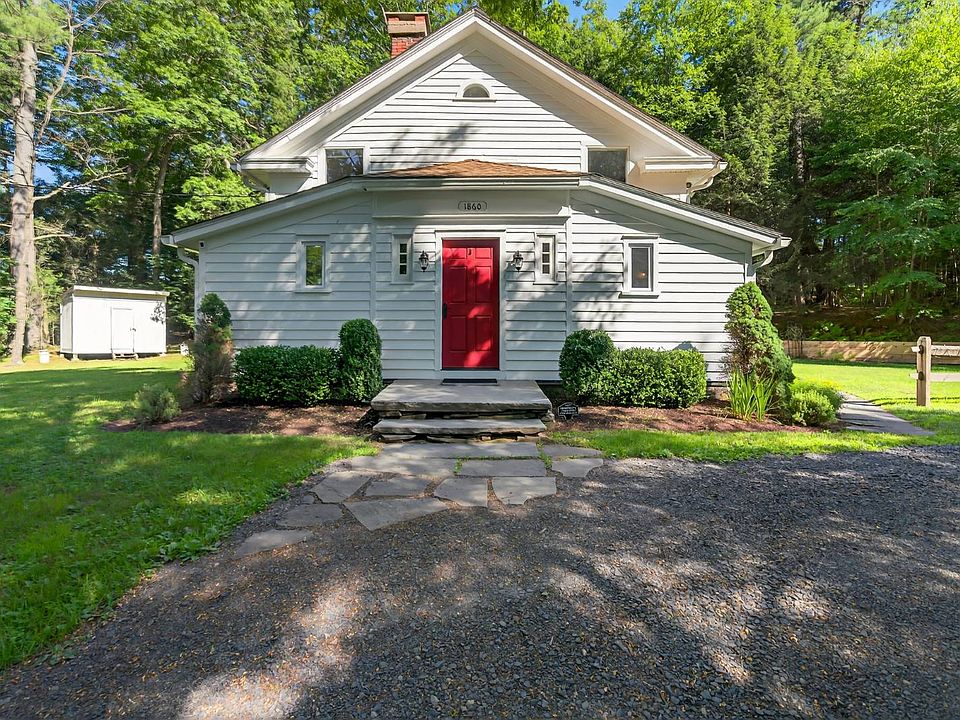 Old School Meets New - A Rare Unique & Historic Retreat with Modern Luxury Originally built in 1860 as a one-room schoolhouse for the children of the local village, this remarkable home blends heritage, history, and high-end updates into a truly special living experience. Thoughtfully sited by the townspeople on a gentle knoll surrounded by graceful trees, the building served as a place of learning through the Civil War and beyond. Students once gathered for plays and pageants in what is now the living room-then a small stage-and lunched on the sunny slope just outside the front door. The home's foundation, crafted from massive three-foot-thick river rock walls, is thought to have been built with stone gathered by the local community-a testament to both the home's roots and its enduring character. Converted into a private residence in 2003 by a Brooklyn architect, the structure was fully modernized with all-new plumbing, electrical, HVAC, and framing, while preserving the original timberframe construction and exposed beams. Today, it stands as a fully updated 2-bedroom, 2-bath home that feels both timeless and contemporary. Vaulted cathedral ceilings and skylights flood the interior with natural light, creating an open, airy ambiance that enhances the home's warm character. The spacious, modern kitchen features high-end stainless appliances and flows into a cozy yet generous family room anchored by a wood-burning stove-perfect for gatherings in every season. The home has been carefully maintained and improved throughout, with over $100,000 in thoughtful upgrades over the past eight years. From the certified 50-year GAF roof and Velux solar skylights, to the whole-house standby generator, smart security, and cutting-edge air purification and HVAC systems, the home offers turnkey peace of mind and long-term efficiency. Surrounded by protected Nature Conservancy land, the property offers exceptional privacy, scenic views, and direct access to miles of wooded trails. Yet, it remains just minutes from schools, shopping, and the train station, offering both seclusion and convenience. A backyard flagstone patio and fire pit, newly resurfaced driveway, whole-house water treatment system, and extensive smart-home features round out the comforts of this idyllic escape. Whether you're drawn to its historical significance, its thoughtful design, or its unmatched tranquility, 62 Guymard Turnpike is a rare opportunity to own a home where the past and future live beautifully side by side.