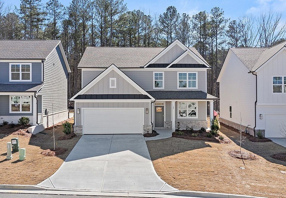 Hamptons at Riverwood South in Dallas, GA is home to this new construction Elle floorplan home at 62 Hampton Terrace. This 2,711 square foot plan offers 5 bedroooms, 3.5 bathrooms, and a 2-car garage. Stepping into a foyer, you'll be greeted by the stairs to the second level ahead and a flex room off to one side. The flex room is space created to suit whatever needs you have: dining, home office, playroom - you name it. Down the hallway you'll pass the powder bathroom and the door to the 2-car garage and be welcomed into the entertaining space. The kitchen boasts lots of counterspace, stainless-steel appliances, a room pantry, and a central island. Off of the kitchen is the perfect eat-in dining space that also provides acccess to the back patio and flows seamlessly into the spacious living room. The Elle is a favorite of many due to the primary suite being located on the main level! A large bedroom, bathroom with a seperate shower and soaking tub, double quartz vanity, and walk-in closet make up the retreat. On the second level you'll find an additional living room, 4 secondary bedrooms, 2 full bathrooms, and the laundry room. If 62 Hampton Terrace sounds like your perfect fit, give us a call today to get more information about this home in Dallas, GA.