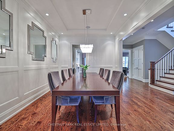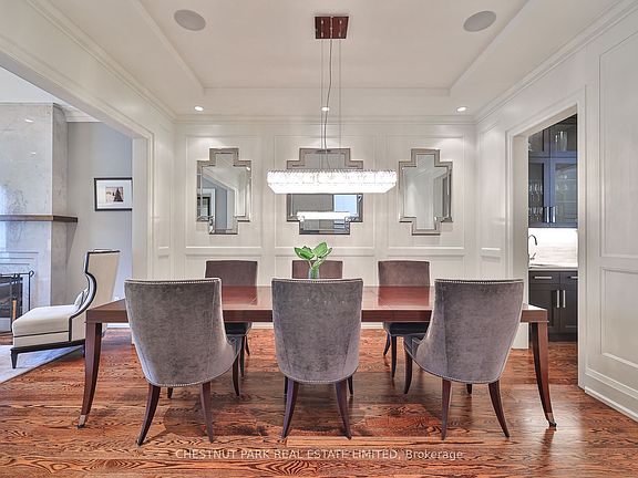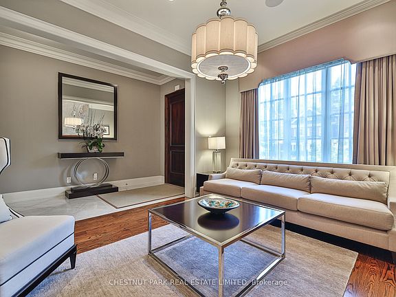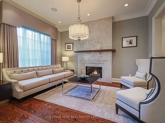 Stunning custom-built home inspired by five-star hotel design. Created for both upscale entertaining and everyday comfort, showcasing 10' ceilings, bespoke millwork, coffered ceilings, crown mouldings, expansive windows, natural stone, and oak flooring. The included curated lighting, custom drapery, and select hardware were professionally designed to complement the interiors. An elegant marble foyer sets the tone with sightlines that extend through the principal rooms to the lush, symmetrical gardens beyond. The dramatic living room with floor-to-ceiling marble fireplace flows to a well-sized paneled dining room, which is serviced by a marble-clad servery complete with sink, beverage fridge and cabinetry. The timeless chef's kitchen features premium appliances, custom cabinetry, and a large marble-topped island, opening to a family room anchored by a marble-surround gas fireplace with custom built-ins. Walk out through double French doors to the professionally landscaped rear gardens, where stone terraces frame a central pergola and built-in BBQ, a true oasis suitable for elegant entertaining or casual relaxation. Ascending the skylit staircase to the second floor, the primary suite beckons through a double door entry, boasting a gas fireplace, walk-in dressing room, hidden secondary closet, and spa-worthy 6-piece ensuite with heated marble floors. Two additional bedrooms have direct bathroom access, while the fourth bedroom currently serves as a home office with built-ins. The lower level is fully finished with an office, exercise room, laundry, and a recreation room featuring a custom media wall, a wet bar, and wine cellar. Additional highlights include a recently upgraded state-of-the-art Sonos 5-zone sound system, mudroom with direct garage access, and a separate side entrance. Spanning over 4,400 sf of refined living and ideally located on a tree-lined street just steps from Yonge and St. Clair, this home is move-in ready.
