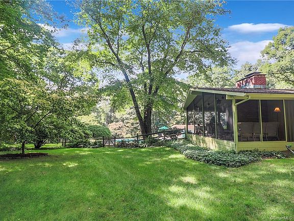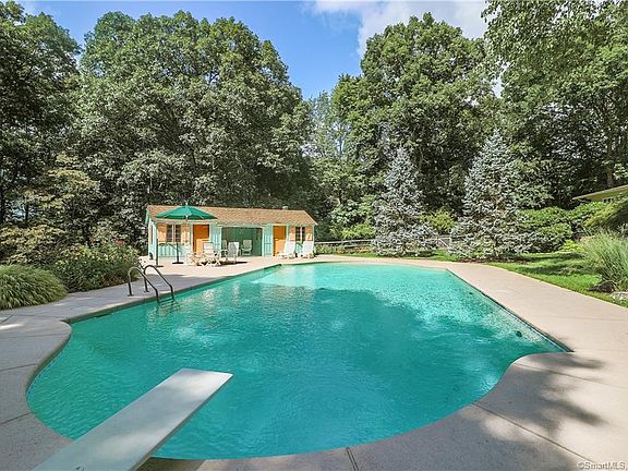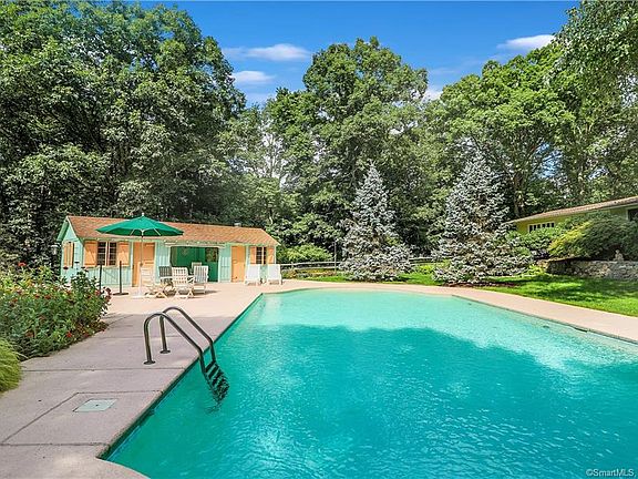 Tucked comfortably amidst lush greenery and mature trees on a cul de sac, this stylish ranch enjoys elevated views, set on a private 2.09 acres in lower Weston. This desirable property features an in ground Gunite Swimming pool, surrounded by a beautiful patio and cabana. The living room has a wood fireplace, Dining room has built-in shelving, high vaulted ceilings and sliders to the back terrace. Remove carpeting and enjoy Hard wood floors throughout. Master bedroom with en-suite and separate double closets. Three additional bedrooms on main level plus media room on lower level. Brand new central air, Water filtration system, stone retaining wall and more. Every piece of this well-maintained residence offers a lot of possibilities.