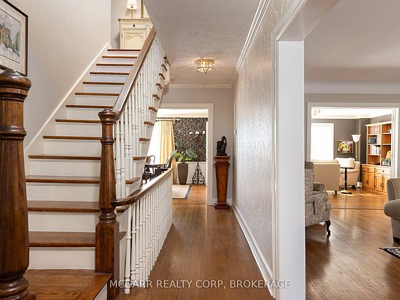 This home has it all. Location, space, property, privacy and a true staycation feel. Entertaining bright living room with fireplace and leads to a light filled library. The formal dining room views the stunning backyard. Enjoy the warming fireplace in the family room or walk out to the two level deck with ground access. The updated kitchen with slate floor has a large island with sink plus there is a bar with a sink and wine fridge. The custom Birchview Cabinetry blends with the Bosch Dishwasher, Fisher Paykel fridge, and Wolf 4 burner gas stove. A mudroom, 2pc and a back stairway finishes the main level. The elegant front oak stairway leads to the upper level where you will find 5 bedrooms, 3 bathrooms and the laundry room. The primary suite has ravine views, gas fireplace, walk in closet and a sitting room. The 5 pc ensuite has 2 sinks, soaker tub and large glass shower. A 4pc and a 3pc services the other 4 bedrooms. The ground level has lots of storage space, 2 walkouts, rec room, and office with a fireplace. The very private terraced yard makes you feel like you are in Muskoka. Enjoy the soothing hot tub, decks, perennial gardens, in ground salt water and solar heated pool, fantastic fully equipped pool house bar with its own 2pc. A home to live in, play in and grow in. This home is perfect for a blended family who also want to have lots of space for privacy. Very spacious deck leading down to a 6 person hot tub and super private hidden alcove area for curling up. Party in the stunning pool level and gather around the fully equipped tiki bar. Come for a visit and stay for a lifetime.