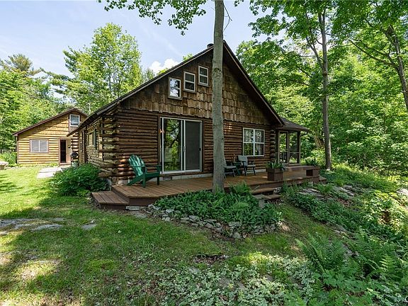 RUSTIC & CHARMING LOG HOME ON 8+ ACRES & INCLUDES A DOCK ON THE ST. LAWRENCE RIVER! Escape to your own private haven with this charming log cabin, perfectly nestled into 8.3 acres of serene woodland, ensuring utmost privacy & tranquility. If that doesn’t impress, this property includes a 4’X24’ dock in Chippewa Bay perfect for boating, fishing, or soaking in the views of the main shipping channel, Singer Castle, & spectacular sunsets. Inside the cozy log cabin which comes fully furnished, you’ll love the open concept living area, exposed beams & warm inviting ambiance. The 1st floor also offers a full bath & 2 comfortable bedrooms idea for easy access & convenience. The rustic charm continues upstairs in the loft which features additional sleeping space for guests. Head outside to the side deck perfect for outdoor dining, entertaining, or simply enjoying the views of the surrounding woodland. There’s also a screened-in porch where you can relax & immerse yourself in nature without the worry of insects, perfect for morning coffee or evening gatherings. A spacious one-stall garage with electric & water provides ample storage for vehicles, boats, outdoor equipment & more. Call today!