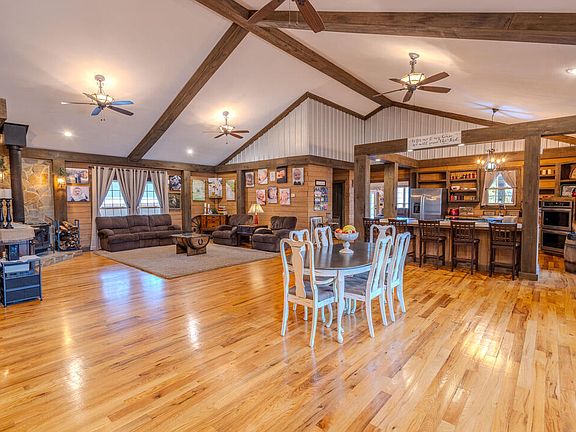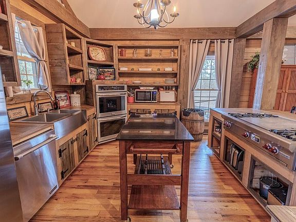 Wood beamsCharming wood-burning stovePaved patioCustom kitchen cabinetsStainless farmhouse-style sinkVentless gas logsPaved driveway and sidewalk