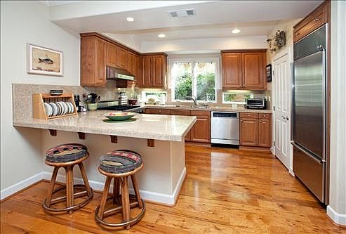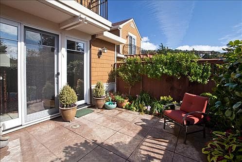 Beautiful end unit with lots of light throughout. Main floor has hardwood floors, large kitchen with granite counters, stainless steel appliances, pantry and nice windows for looking out to garden. Gas burining fireplace in living/dining room with large patio and garden area to front door. Main level also has French doors leading to a bedroom with full bath and private patio.Upstairs has two bedrooms and two full baths. Master bedroom has a walk in closet in the master bath, tub and shower. There is a deck off the master bedroom with open view.There is an elevator just outside the unit that goes to the parking garage with two assigned parking places and a personal 100 sq. ft. storage unit.One owner must be 62 years of age. Great location for walking to town along the pathway. Nice home for living or investment. Tenants have lease until June.Rarely on the market, this complex is popular. Shows beautifully. Courtyard has nice fountain and sitting area. Complex is gated for security and nice meeting area at entrance.