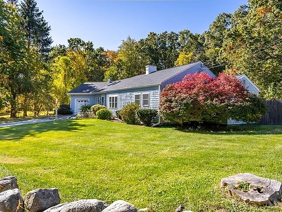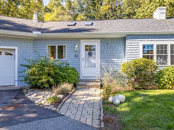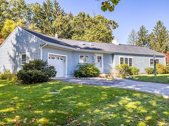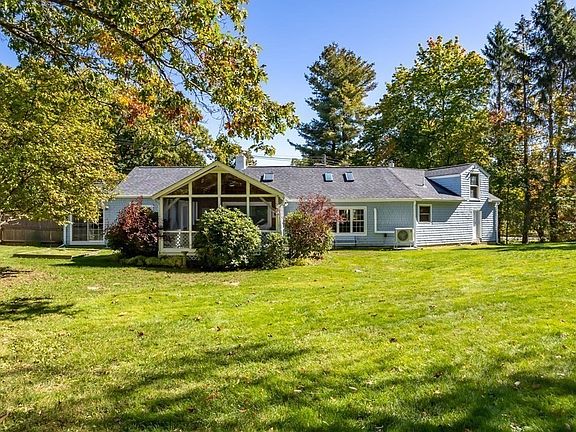 Looking for the elusive one level home or condo alternative with a private back yard? Set behind a classic New England stone wall, this stunning contemporary ranch with screened porch sits on a level lot which abuts acres of Great Hill conservation land and trails, allowing for private entertaining. Entering the hardwood floor great room will wow you with its high ceiling, skylights, built in bookcase and huge picture window dining area, along with the stone hearth fireplace ready for a gas stove. The granite counter galley kitchen is newly appointed with attractive backsplash, new cabinets, range , micro wave and fridge. The powder room offers desirable quartz counter ,the main bath has distinctive pendant lighting. Enjoy the sunlight streaming into the front picture window in the den/office. Relax n the serenity of the main bedroom with a slider overlooking the private yard. A wonderful closet is filled with organizers. The other generous bedroom can accommodate a king size bed.