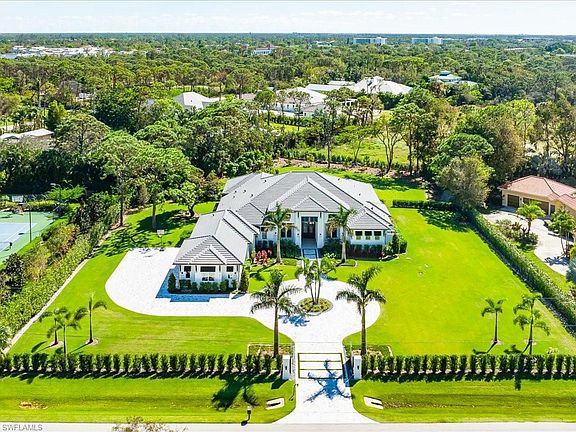 Captivating and stylish, this single-story Naples home set on 1.37 acres in the sought-after Pine Ridge Estates is one you're sure to admire. Manicured gardens and a gated circular driveway welcome you inside this 1-year-old residence where you'll discover high-end finishes and innovative design details throughout. French doors usher you into the expansive living room where vaulted ceilings are enhanced by exposed beams, large glass sliders frame your outdoor oasis, and a linear fireplace is flanked by sleek built-in shelving. Your seamlessly connected kitchen has an oversized multi-seater island, stainless steel appliances, gorgeous white cabinetry, and a pantry with a wine chiller. The luxurious proportions of the primary suite treat you to direct outside access, a walk-in closet with built-in organizers, and an opulent ensuite with a freestanding soaking tub and a two-person, multi-head shower. Enjoy ultimate outdoor entertaining on the covered south-facing patio with multiple sitting spaces, a built-in kitchen, a pristine pool with a spa, and a fireplace. As a bonus, you'll have a family room, an office, a laundry room, and an attached 3-car garage. Come for a tour today!